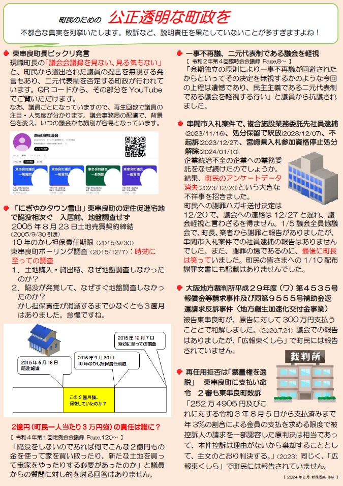 「252万4905円及びこれに対する令和3年8月5日から支払済みまで年3%の割合による金員の支払を求める限度で被控訴人の請求を一部認容した原判決は相当であって、本件控訴は理由がないから棄却することとして、主文のとおり判決する。」(2023)同じく、「広報東くしら」で町民には報告されていません。